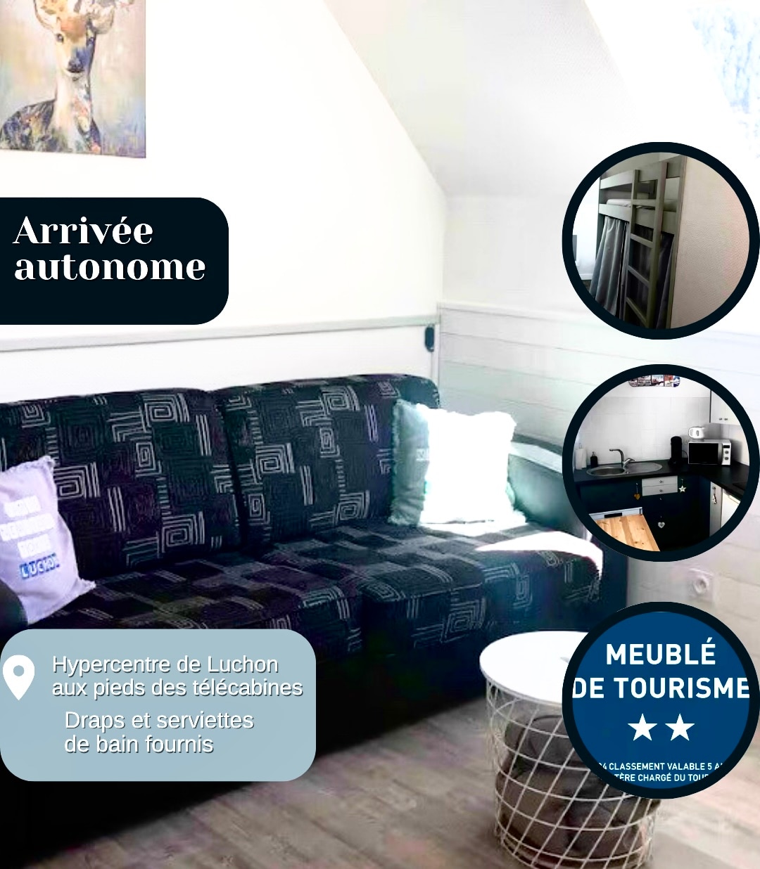 Appartement de 23m², idéalement situé au cœur de Luchon. Aux pieds des télécabines qui vont à Superbagnères et accès direct sur les allées d'Etigny. Classé 2 étoiles, parking privé au sous-sol de la résidence, cave privée. Lumineux, appartement traversant, au dernier étage d'un immeuble avec ascenseur. Tout se fait à pieds. Les couchages se composent d'un canapé-lit (160x200) + 2 lits superposés (90x190). Le linge est fourni (linge de lits, serviettes de bain). La cafetière est une Tassimo