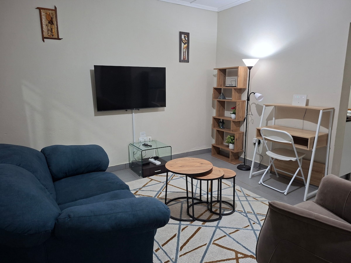 Modern, private, and perfectly located! Enjoy an LG Dual Inverter AC, LG OLED Evo AI 55" TV (2025 model) with prime video. Netflix, YouTube etc. Starlink WiFi. 2m orthopedic hybrid bed, 24/7 power, hot water, a solar iron, and a full kitchen with gas stove, double-door fridge, bar stools, and cocktail glasses. Relax in a cozy living room with a ceiling speaker, workspace, and beautiful couch. Just 5–10 minutes from six malls. You’ll love it here. Book now!