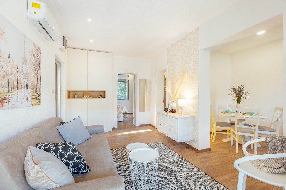 Bine ai venit la Tamaris, un apartament confortabil pe promenada de pe malul mării! 🌊 Bucură-te de priveliști uimitoare ale golfului prin peretele de sticlă din living, unde canapeaua se transformă într-un pat confortabil. Bucătăria modernă este complet echipată pentru șederi mai lungi, iar baia luxoasă cu duș cu efect de ploaie oferă un refugiu asemănător unui spa. Renovat în 2022, îmbină stilul și confortul. Notă: în iulie și august, viața de noapte vibrantă și zgomotul de seară o fac ideală pentru oaspeții mai tineri care se bucură de vibrații de vară pline de viață! 🎉