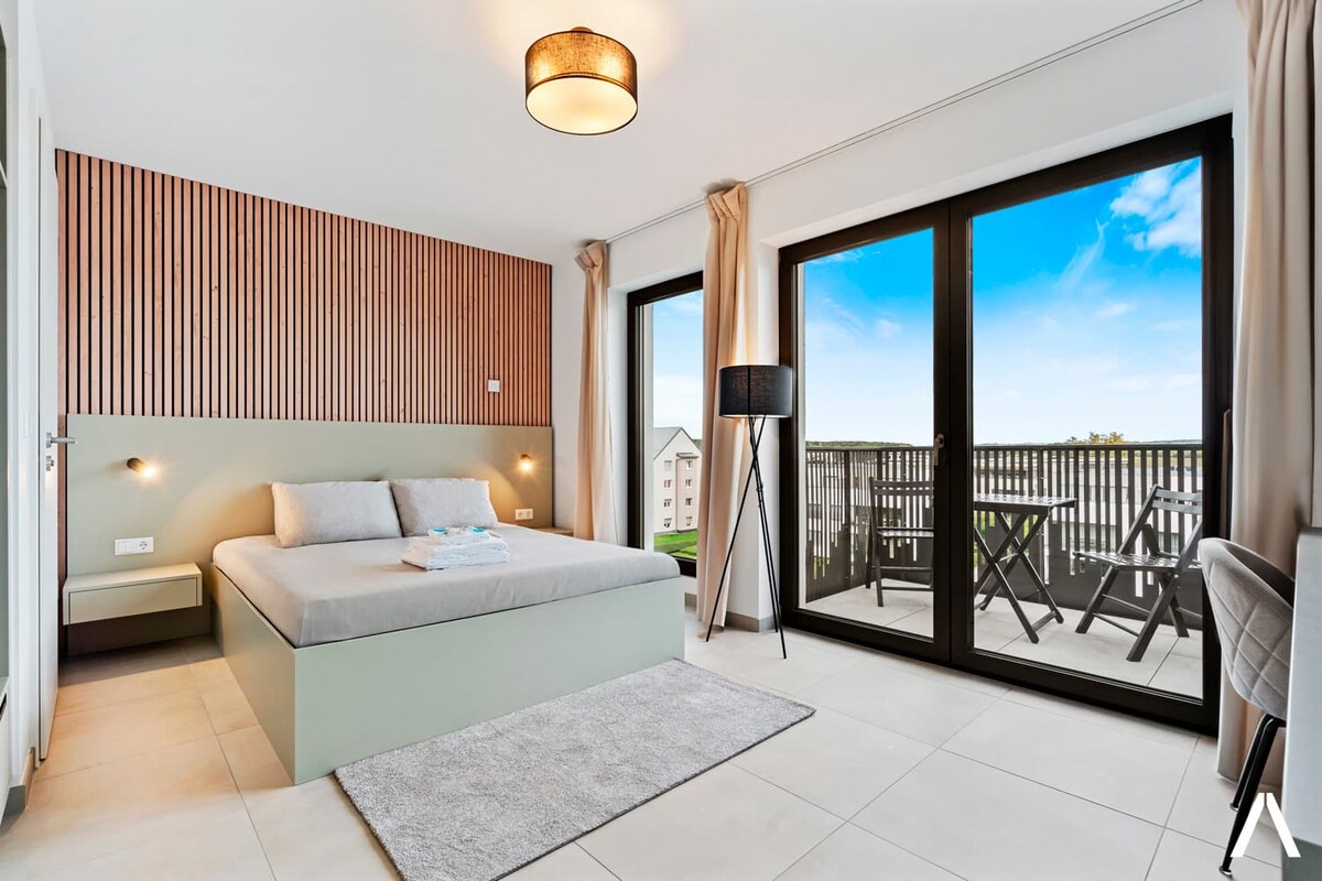 ✔ Spațios și luminos: bucură-te de un apartament modern, bine echipat, cu priveliști uimitoare. Dotări ✔ de lux – acces la o piscină și o sală de gimnastică în clădire. ✔ Locație excelentă – stație de autobuz chiar în față și o pădure în apropiere. Parcare ✔ ușoară – parcare plătită chiar în fața imobilului. ✔ Confort și confort – Wi-Fi complet mobilat, rapid, o zonă de living confortabilă și o bucătărie bine echipată. Fie că ești aici pentru muncă sau petrecere a timpului liber, acest apartament oferă combinația perfectă de confort, comoditate și lux.
