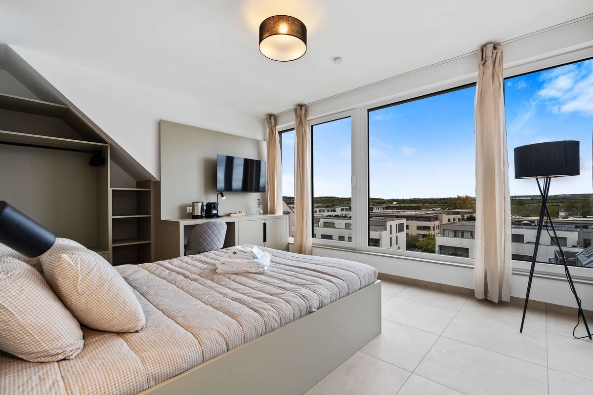 Această locuință unică are un stil propriu. Dacă dorești să ai „pachetul complet” în timpul unei călătorii de afaceri sau într-o simplă escapadă de weekend în Luxemburg, atunci acest studio uimitor te așteaptă. Acest studio fermecător de 42 m2 este situat în frumosul turn Cloche d'Or, cu acces gratuit la piscina proprie a clădirii, saune și sala de fitness. Stațiile de autobuz și tramvai sunt chiar în fața intrării în clădire și te pot duce gratuit în centrul orașului în câteva minute.