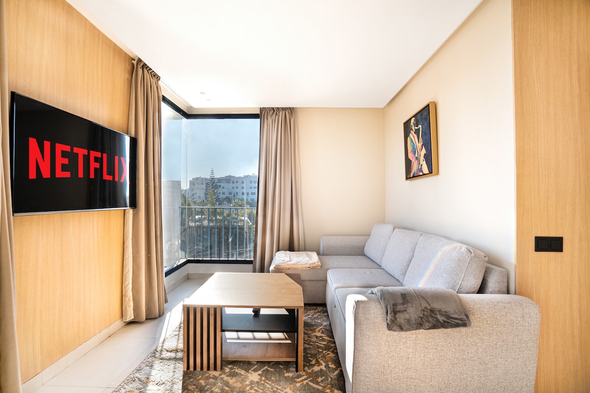 Perla 403💎, un refugiu de pace în care eleganța unei reședințe moderne se îmbină cu confortul hotelurilor de 5* din inima orașului Casablanca! Relaxează-te într-un living spațios cu un design modern, dotat cu un Smart TV de 55’cu Netflix și IPTV pentru seri de relaxare absolută. Camera, un adevărat cuib confortabil, promite nopți liniștite și reconfortante ☁️ De la balconul tău privat, urmărește apusurile de soare splendide deasupra orașului, făcând fiecare moment al șederii tale de neuitat! ✨