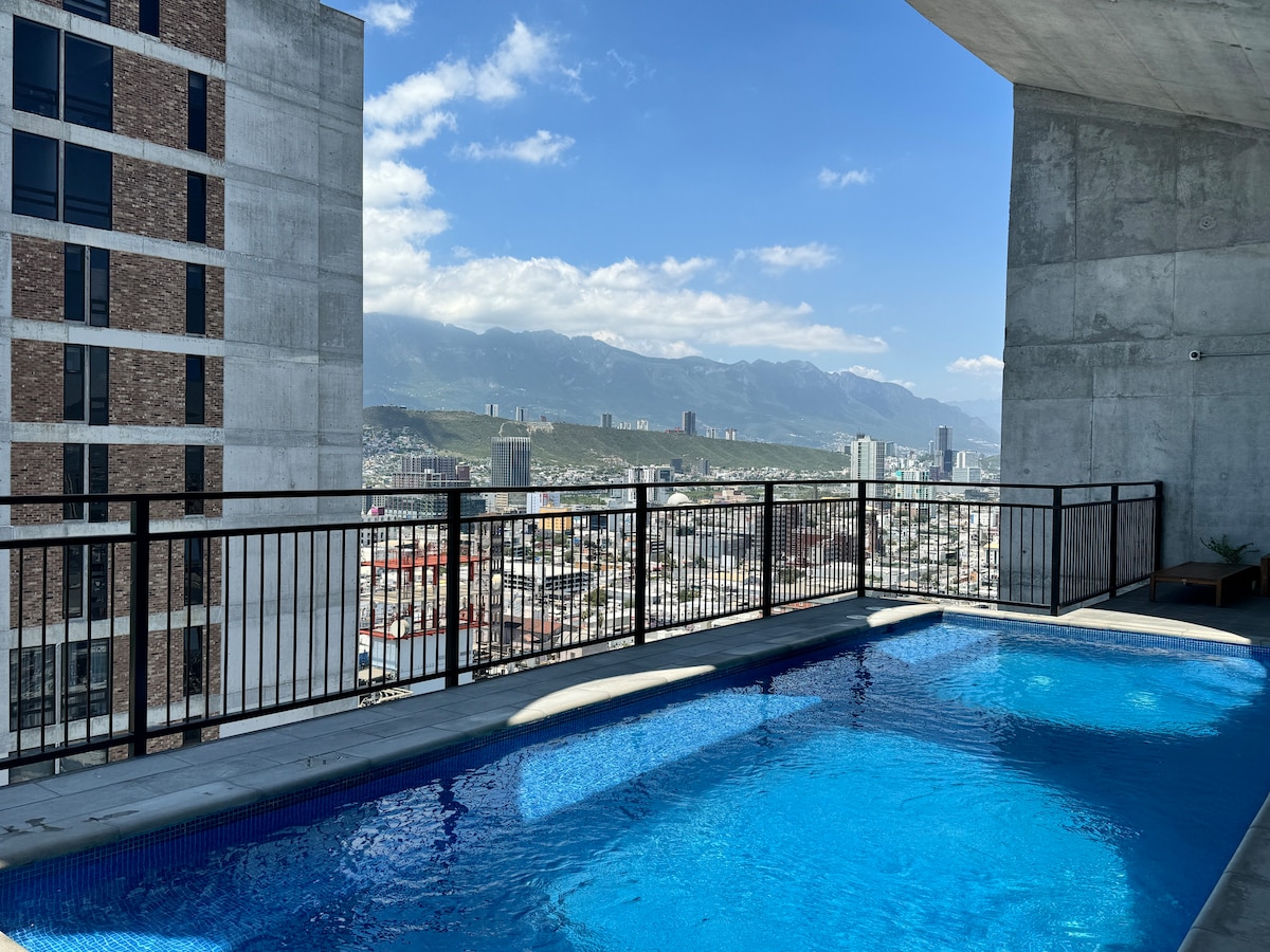 Welcome to Barrio W Tower A in Monterrey! Apartment on the 26th floor with spectacular views, located in downtown Monterrey. Fully equipped for long stays and everything you need for your daily life. 🏆2024 Excellence Award in architecture Amenities: -Pool on the terrace. -Gym. -Coworking space. -Hammocks. 2 minutes from Macroplaza and 5 minutes from the History Museum and Paseo Santa Lucia. The building has paid parking**. Parking meters on all surrounding streets.