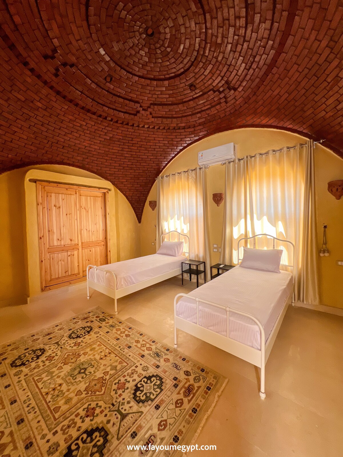 Overlooking Qaroun natural lake the biggest lake in Fayoum oasis, 120 km southwest of Cairo, Egypt. enjoy the green fields, blue water of lake Qaroun and the great west desert. Experience staying in a mud break house. and feel how it is peaceful for your soul.