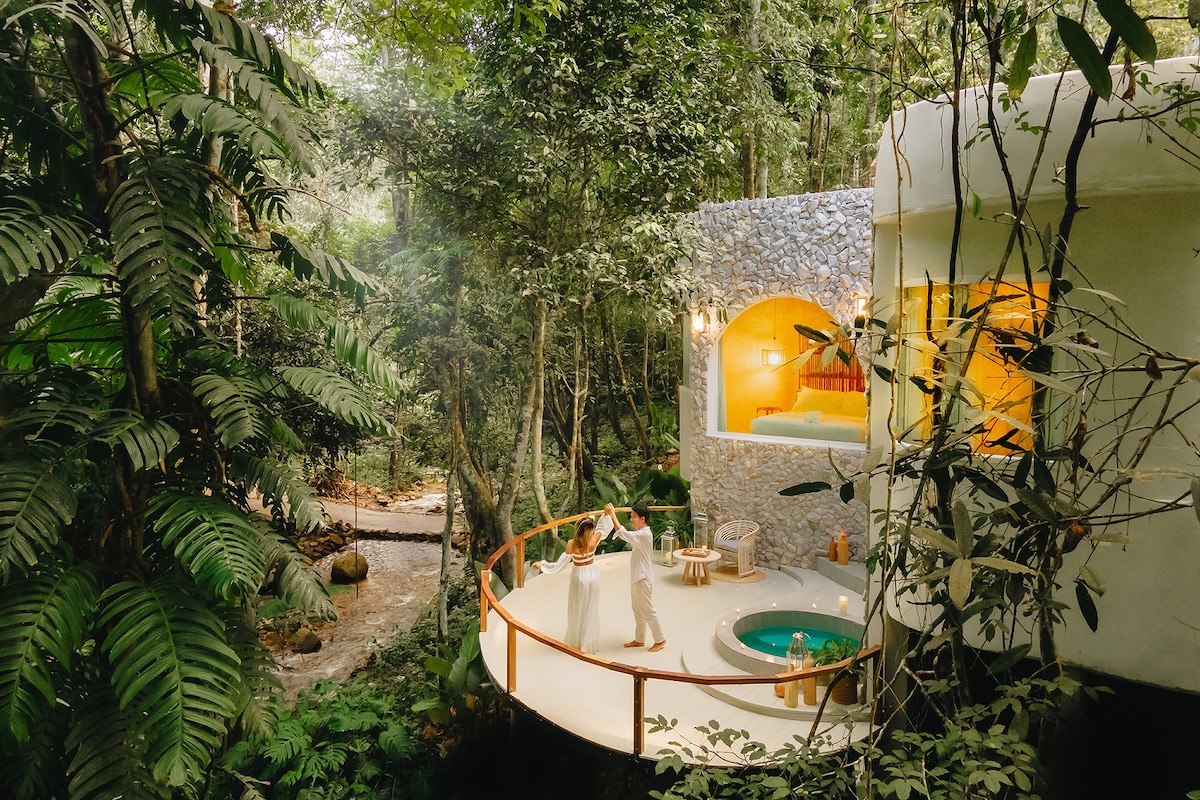 Garden view One-bedroom villa with a rooftop jacuzzi. Surrounded by nature with blue sky by day and stars at night.