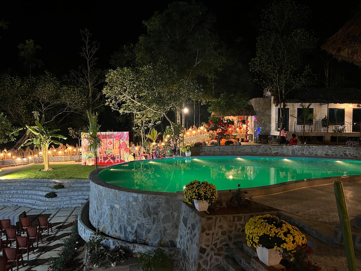 2 bungalow-uri minunate în satul Na Phon - Mai Chau, cu o grădină frumoasă și vedere la câmpurile și munții uriași. Fiecare bungalou are 1 pat dublu, dacă se solicită acest lucru, se poate adăuga un pat suplimentar. Vino să simți Tet House și vei spune „Mă voi întoarce”