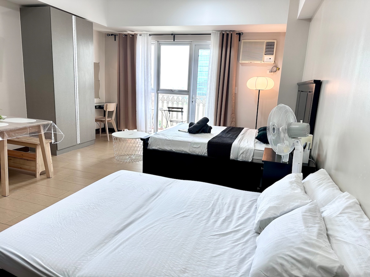 Bine ai venit în studioul tău confortabil și elegant din inima orașului Makati CBD! Ideal pentru călătorii de afaceri, vacanțe sau escale la aeroport. Se potrivește confortabil cu 3 persoane, cu un pat matrimonial și extensibil. Bucură-te de Wi-Fi de 20 Mbps, Smart TV cu Netflix și o chicinetă complet echipată cu aragaz cu inducție, cuptor cu microunde, frigider, vase și ustensile. Mergi pe jos până la Little Tokyo, Makati Cinema Square, Greenbelt, Glorietta. Clădirea are piscină, piscină pentru copii, sală de gimnastică (taxă) și parcare plătită (în funcție de disponibilitate).