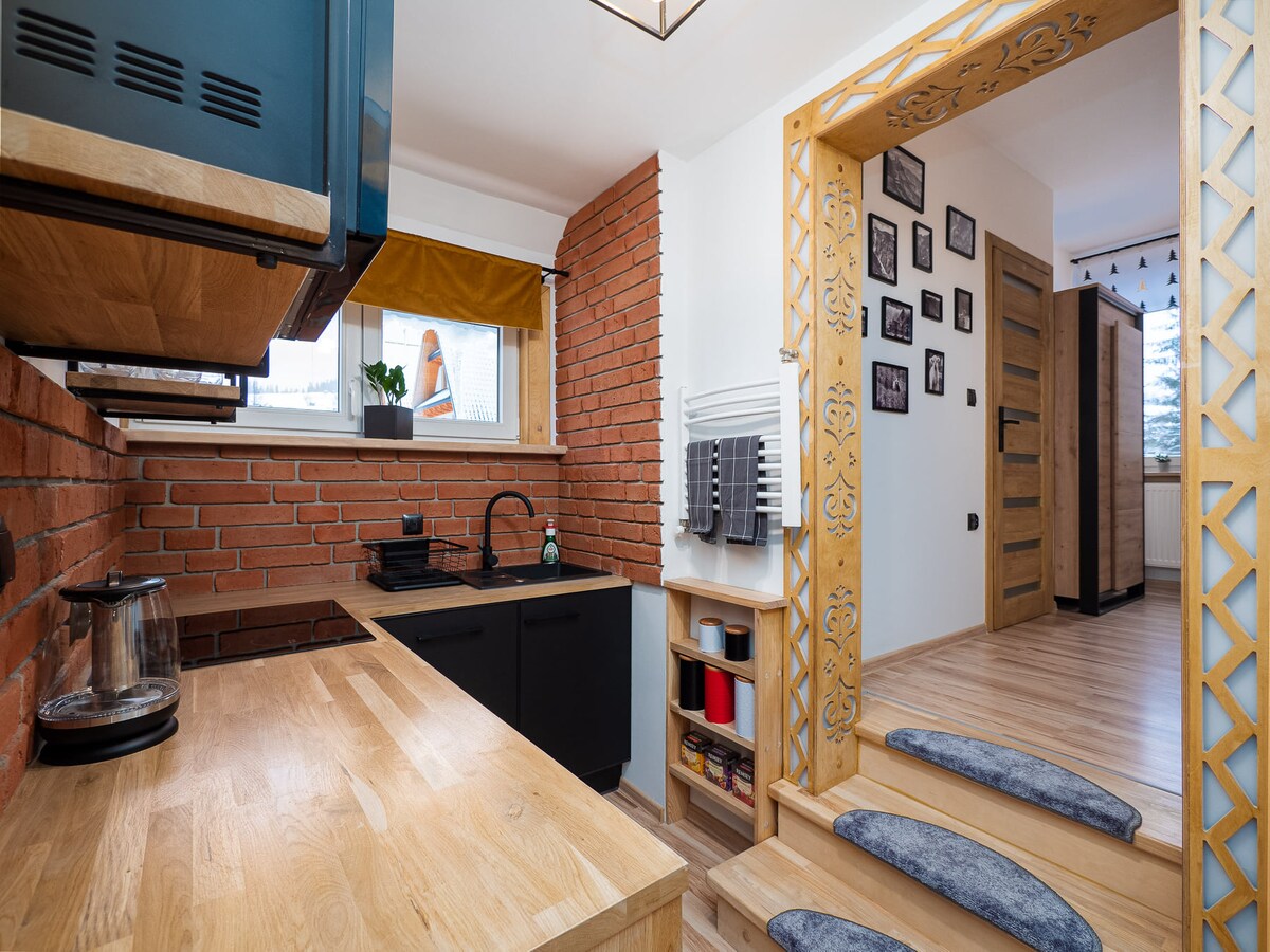 Apartament cu un singur nivel (100 m2) situat într-o casă din lemn la o altitudine de 1050 deasupra nivelului mării!!! Intrarea este separată. Apartamentul are o terasă mare, oferim șezlonguri. Priveliștea munților „intră” în living:) Poți parca mașina în cadrul proprietății. Sauna și șemineul sunt gratuite , 2x jacuzzi (cadă cu hidromasaj din lemn) plătită suplimentar. Poți ajunge la Gubałówka pe jos(1 oră) și poți merge cu frânghia până la Krupówki (4 minute). Împrejurimi: trasee de drumeții și ciclism, pârtii de schi!