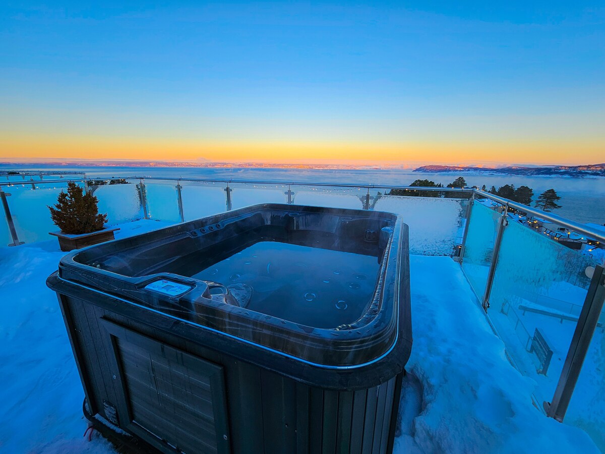 Casă mare și modernă, perfectă pentru un sejur cu iubitul, familia sau prietenii. 8 paturi, 3 etaje, baie mare, 3 toalete, home cinema PRO fantastic, proiector laser de 130 inch pentru meciuri de fotbal sau serate de film. Carport cu încărcător auto. Panoramă de la toate etajele casei și de pe terasa spectaculoasă de pe acoperiș cu jacuzzi de lux cu apă sărată pentru 3 persoane, disponibil și iarna. Aproape de mall, plajă, trasee de drumeții și multe altele. Aproape de aeroportul Værnes și Trondheim. De asemenea, se închiriază lucrătorilor aflați în misiune în zonă.