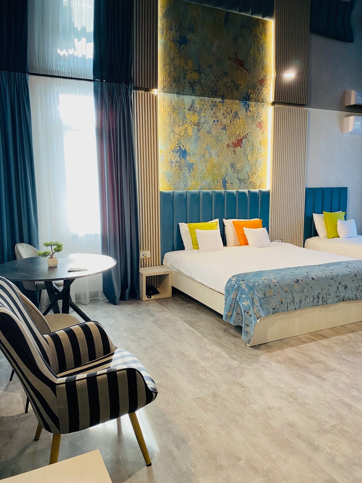 Cozy lavish double room in a family boutique hotel, conveniently located in Mamaia North/Navodari district, 5 min walking distance from the beach. Ideal for 2 persons, for larger groups we can provide alternative accomodation options in the same hotel.