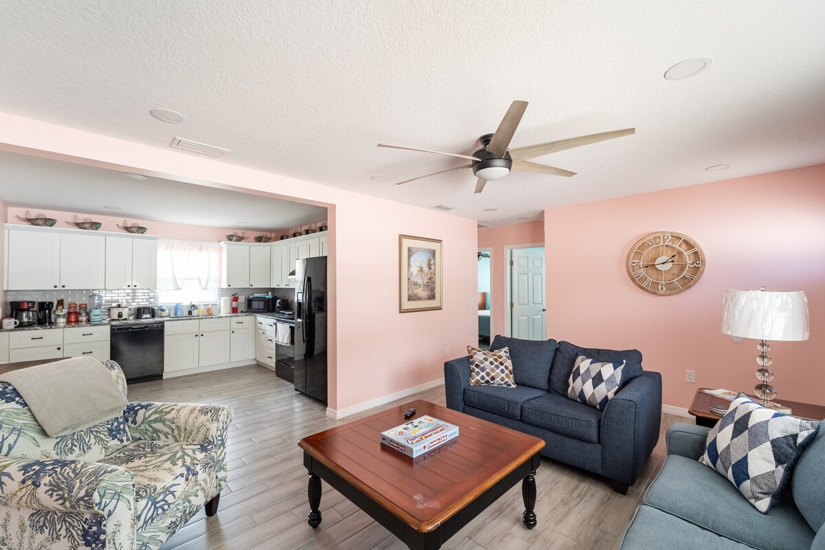 ☀️ Această casă 4bdrm/4bath este perfectă pentru grupuri mari sau divertisment. Locuri de dormit 14!!! 3 paturi king-size și 2 paturi supraetajate (3 paturi twin, 1 Full), Trundle și canapea extensibilă. Fiecare cameră are propria baie privată cu gresie de marmură. Mergi sus în sala de mese de biliard cu bar încorporat. Apoi, la etajul 3, terasa de pe acoperiș pentru plajă și apusuri de soare. Curtea din spate include o vatră, piscină pentru 12 persoane, teren de minigolf, duș în aer liber, grătar, biciclete și magazie cu dotări pentru plajă! Doar câțiva pași până la plaja în sine. Spațios și recent renovat!