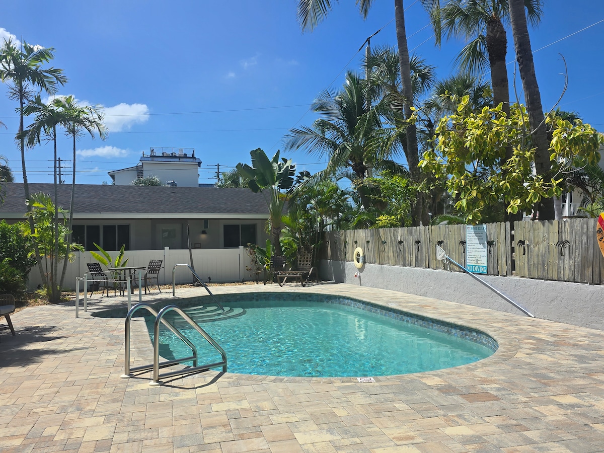 Palm Tree Villas offers a portfolio of eight unique 1950's resort rooms ranging from small studios to three bedroom villas with three bathrooms. We would love to host you for a wonderful quaint island getaway vacation. Conveniently close to the trolley line with many great eating spots around and close enough to walk to the beach. This offering is an extremely popular 2 bedroom-2 bathroom, fully equipped condo with dining and living area and a private backyard patio with barbecue grill.