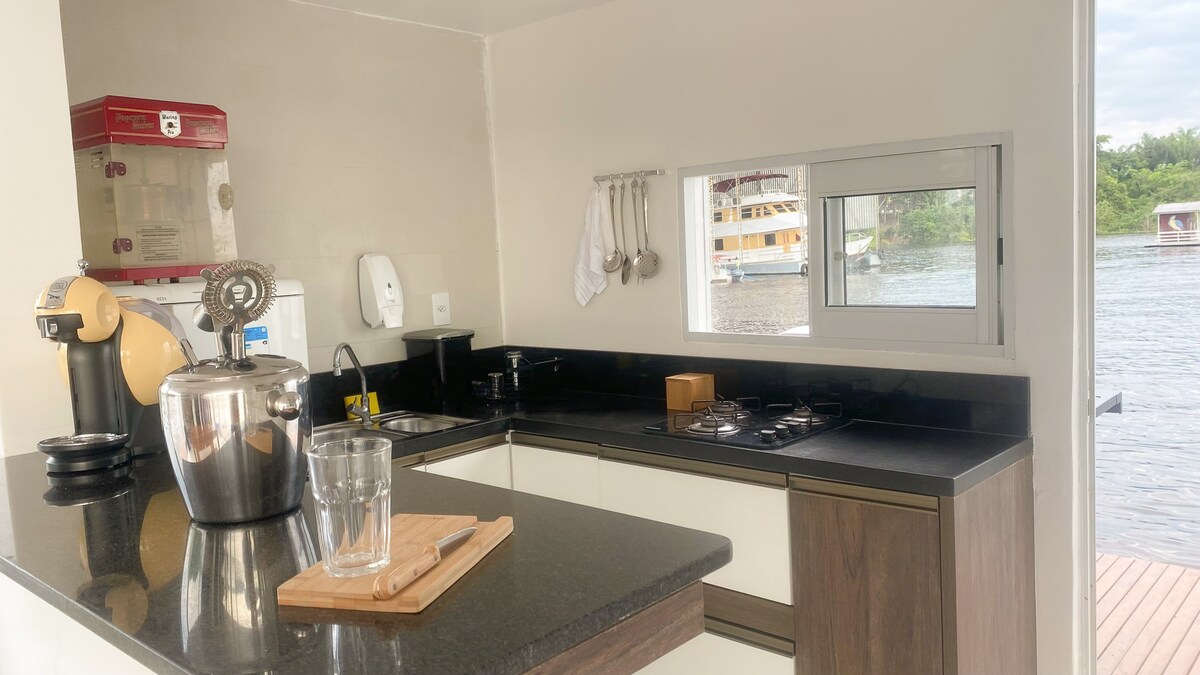 Este lugar é a definição de único e exclusivo. Perfeito para casais que buscam paz e tranquilidade ou até pequenas famílias. Nossa propriedade fica localizada no coração da Amazônia, no lago Tarumã com uma vista espetacular do pôr do sol e também o nascer da lua, dois espetáculos memoráveis da natureza, tudo isso do deck da nossa casa flutuante. Possuímos uma suíte aconchegante com cama de casal e com ótima decoração. Possui churrasqueira a gás, cozinha 100% equipada e ducha externa.