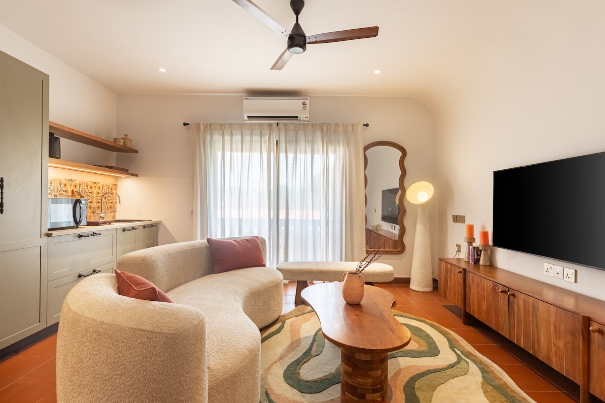 Kanso by Earthen Window is a quiet 1BHK in Siolim, shaped around earth, light, and privacy. Designed for slow mornings and unhurried evenings, the interiors are done with limewashed walls, soft microconcrete floors, and thoughtfully chosen objects that gives it a villa like charm. The bedroom opens to a PRIVATE GARDEN TERRACE and a secluded microconcrete hot tub with JACUZZI, both overlooking uninterrupted green forest. Shared amenities include a pool, steam room, gym, and 24×7 security.