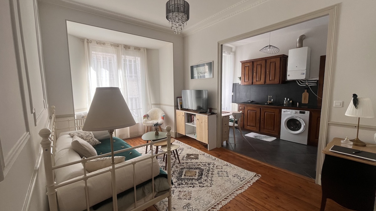 Profitez d'un logement neuf, élégant et idéalement situé. Ce T2 rénové se compose d'une chambre, un salon/salle à manger, cuisine et salle d'eau avec WC. Situé à 15 min à pieds de la cathédrale, 5 min du stade vous pourrez profiter de toute les commodités. Travailleur ou Vacancier, vous disposez d'une entrée privée ainsi qu'un parking gratuit. Sur demande : - Possibilité d'abriter vos 2 roues dans un garage fermé. - Mise en place et préparation d'un second couchage (si 2 couchages distincts).