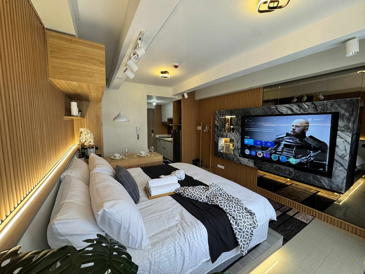 Modern și spațios 1BR cu balcon și piscină la doar câțiva kilometri de aeroport și la câțiva pași de numeroase atracții din zona Golfului Manila. Bucătărie bine echipată, living însorit, pat confortabil, Wi-Fi, Netflix, aer condiționat și TV atât în living, cât și în dormitor. Cazare perfectă pentru cupluri, familii mici sau călători de afaceri. Saună și zonă de joacă pentru copii - gratuit Piscină - gratuită până la trei oaspeți; P200 pentru fiecare oaspete suplimentar.