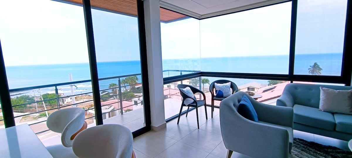Apartament de lux cu 2 dormitoare, 2 băi cu vedere la ocean în hotelul de 5 stele POSEIDON. Acesta include utilizarea unei piscine și a unui jacuzzi orientat spre mare. Living/Terasă/Bucătărie/ TV/ Wi-Fi . Maestru : pat dublu al doilea dormitor: pat dublu. Bucătărie complet utilată/mașină de spălat/ parcare. Piscina este locul perfect pentru a avea vreme cu familia . Plajă artizanală privată. Ieșire la mare. Clădirea este situată în cea mai bună, nouă și mai sigură zonă din Manta „Via Barbasquillo”.