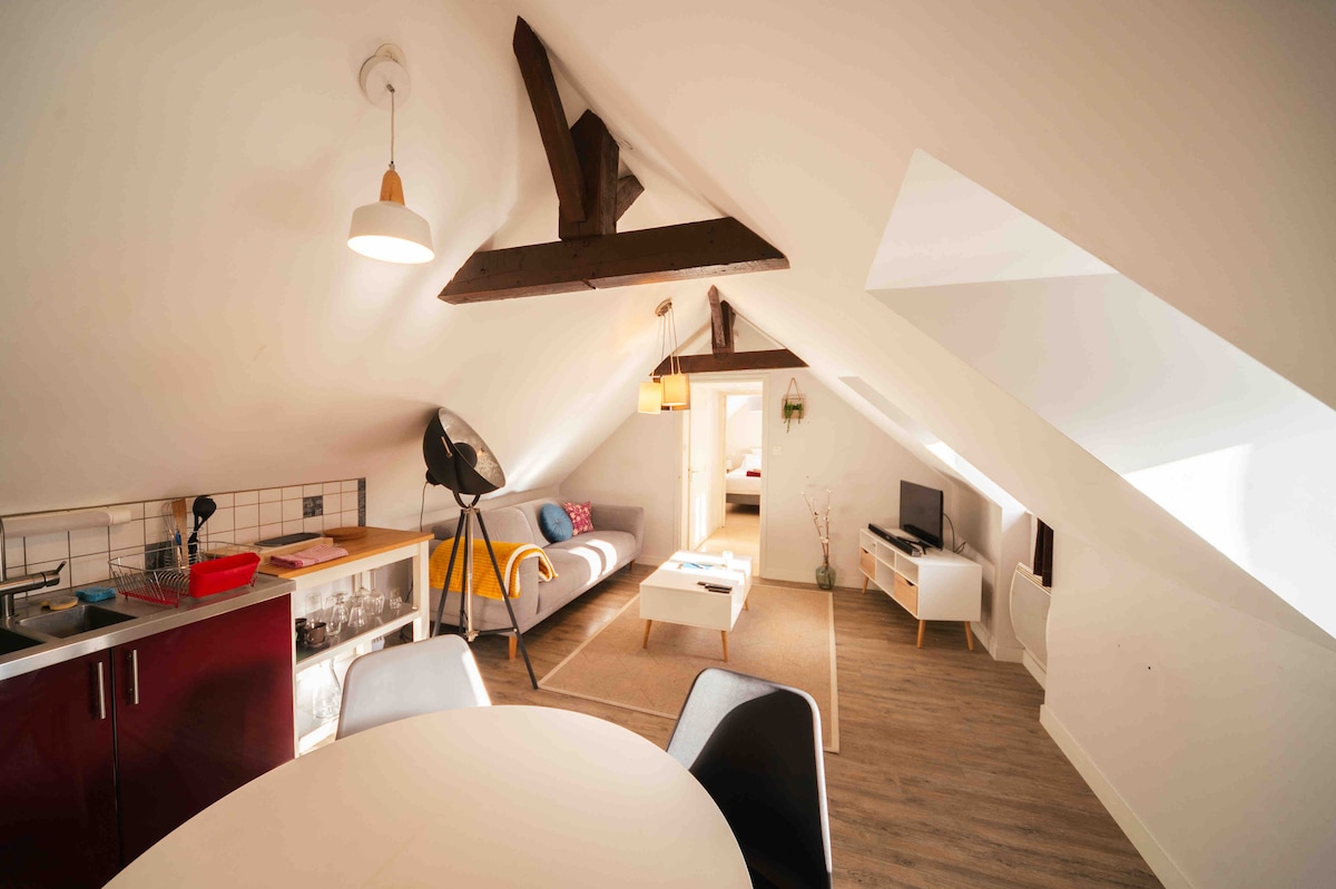 Apartament foarte confortabil la mansardă, în centrul orașului Avranches - aproximativ 430ft2. Aproape de toate magazinele și la 2 minute de mers pe jos de strada comercială principală. Situat ideal: la 3: 30 de Paris, la 1 oră de Caen și Rennes (A84) și la numai 30 de minute de Mont St. Michel.