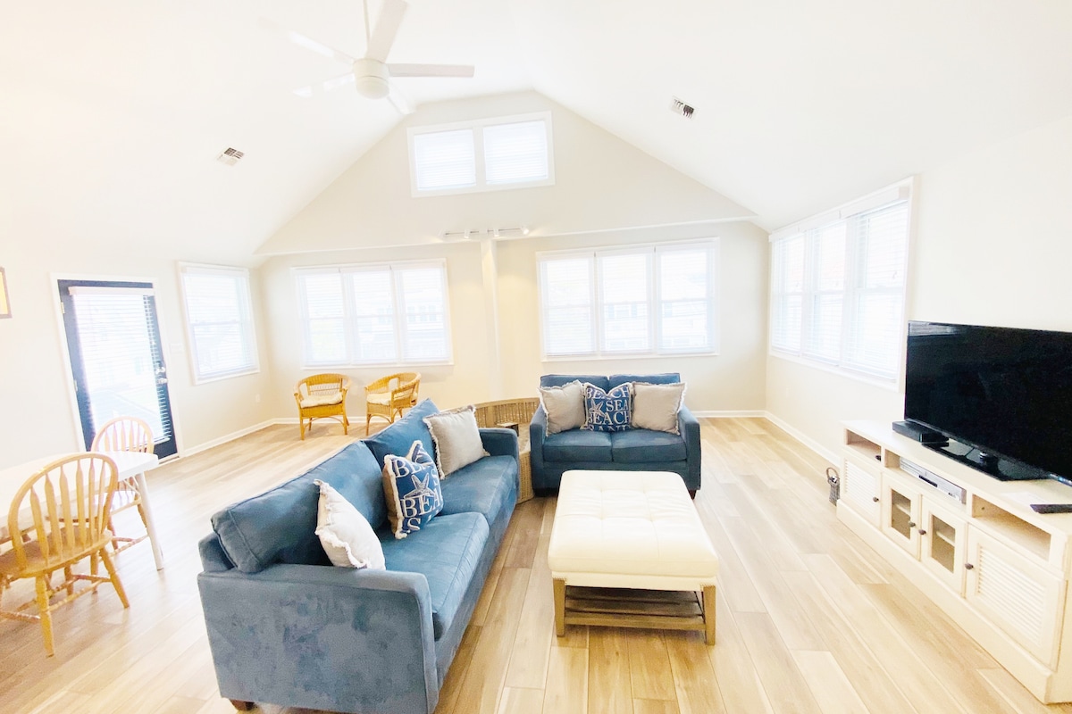 Bine ai venit la refugiul tău de vis pe plajă — la doar 2 străzi de nisip și la câțiva pași de tot ce îți poate oferi Ventnor! Caracteristici principale: - Casă complet remodelată, cu tavane de peste 10 metri și o curte pavată de 200 mp cu vedere la golful peekaboo - Parcare pe alee pentru 2 mașini pentru această unitate și 1 mașină pentru unitatea de la parter în stil tandem. - Potrivită pentru câini, cu o taxă pentru animale de companie de 80 $ (Ne pare rău, fără pisici — suntem foarte alergici😔) - Smart TV (Netflix, Hulu, YouTube — trebuie doar să te conectezi cu contul tău) - 4 șezlonguri incluse