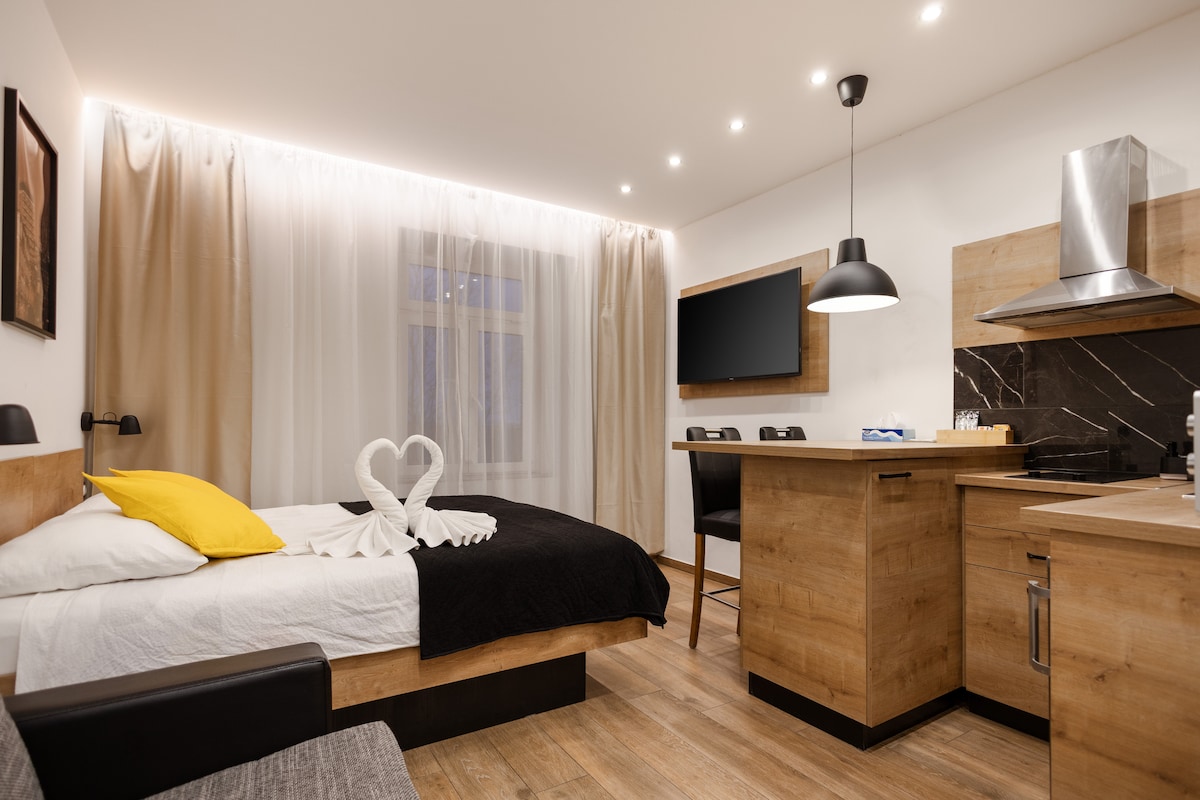 Acest apartament modern include o bucătărie completă, un dormitor combinat și o zonă de living cu o canapea extensibilă confortabilă și o baie actualizată recent. Apartament este situat la primul etaj și în centrul istoric al orașului. Este ideal pentru cupluri, mai ales dacă sosesc cu autobuzul, deoarece se află la un minut de mers pe jos de stația centrală de autobuz. Apartamentul este foarte bine echipat. Mașina de spălat vase și mașina de spălat cu uscător sunt situate în bucătărie, iar televizorul în livingul cu aer condiționat.