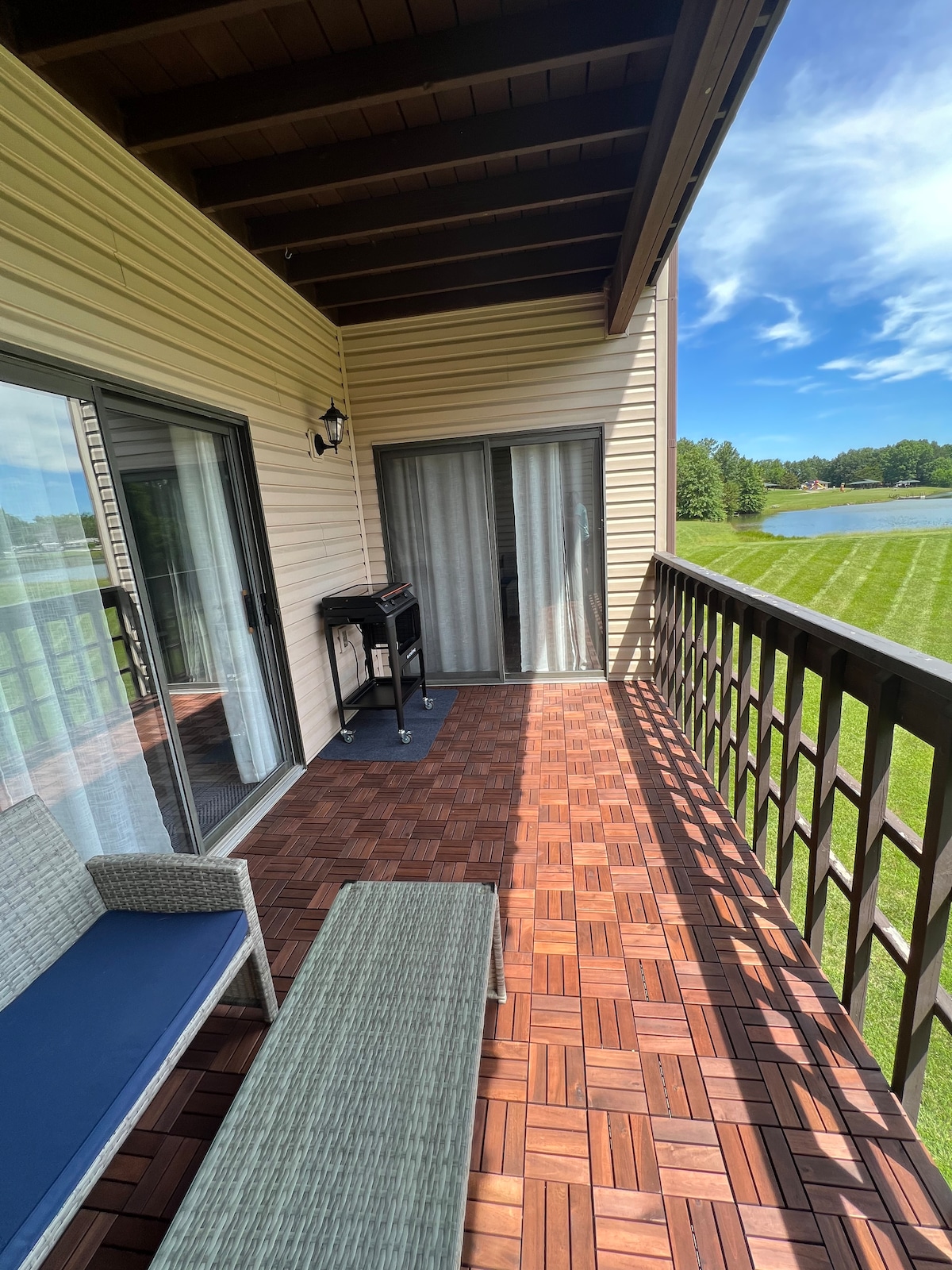 Spacious 1,012 square ft upper level condo at Mark Twain Lake is just over a mile from Spalding Swimming Beach and a mile from Spalding Boat Ramp. Jellystone is about ½ mile up the road and The Water Zone waterpark is across the street from the condo entrance. The kitchen/dining area/living room are all open and leads to a private balcony deck for more space or relaxing during dinner. Washer and dryer, 2 full baths, and a loaded kitchen make a perfect, relaxing stay!