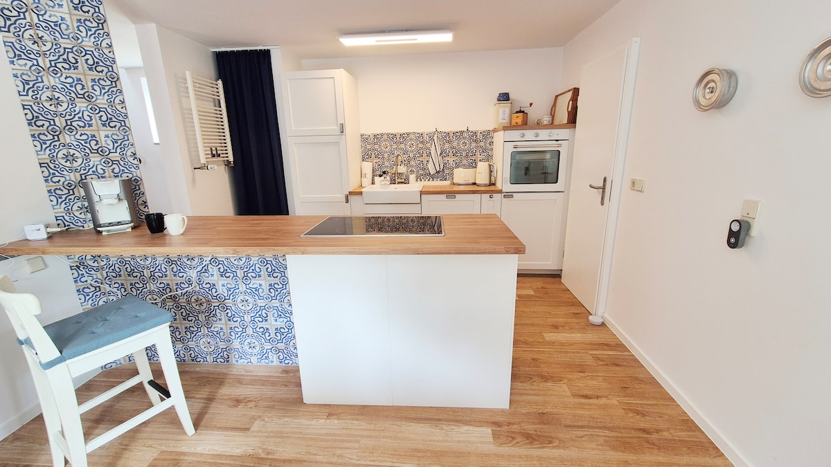 Helle 1-Zimmer-Wohnung im 1. OG mit Balkon, großem Schrankbett und Schlafcouch. Ideal für 2 Personen oder eine kleine Familie mit Kind. Küche und Schlafbereich sind durch einen Vorhang optisch trennbar, was zusätzliche Privatsphäre schafft.