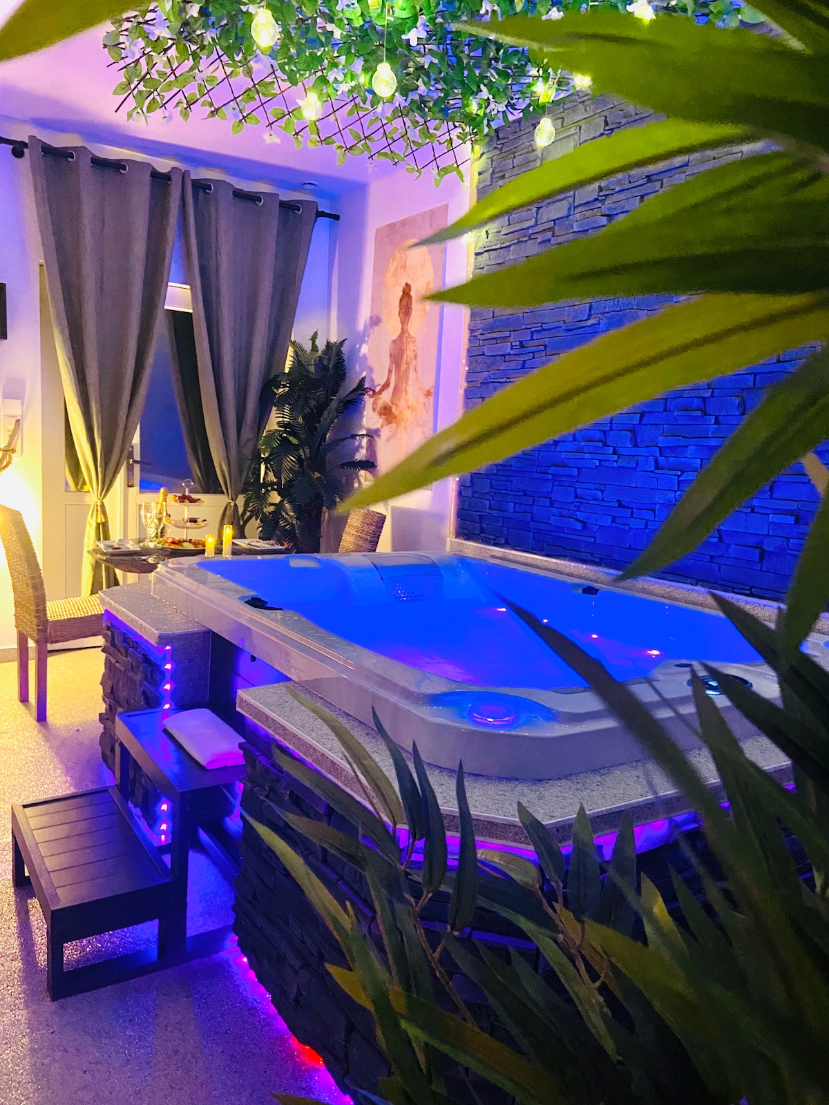 aparthotel atmosferă confortabilă și romantică pentru o schimbare garantată de peisaj o noapte romantică pentru a te bucura la maximum de un centru spa de ultimă generație. cascadă, spa încorporat prin Bluetooth 3 living cu ecran plat conectat, Wi-Fi , cameră boltită cu pat matrimonial șaisprezece rotunde Duș italian halat de baie halat de baie cu gel de duș uscător de păr ⚠️ Standard de siguranță pentru spa Poate găzdui maximum 200 kg Sosire în intervalul 18:45 și 19:00 Nu mai este posibilă sosirea după ora 19:30 garanție 200 €