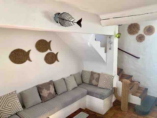 Casă de 45 m2 pe 2 niveluri complet renovată cu servicii de calitate în inima satului, într-o zonă liniștită, la 2 minute de mers pe jos de magazine, restaurante... și la 5 minute de port. Parter: canapea cu 3 locuri/zonă toaletă Etajul 2: living, sufragerie/bucătărie complet utilată Terasă orientată spre sud-est, cu living Etajul 2: Dormitor: 140x190 pat (lenjerie de pat Epeda), dulap separat cu sertare/dressing/baie: duș și toaletă Parcare gratuită în apropiere.