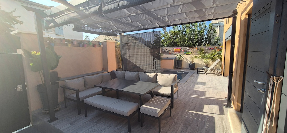 Oferim un apartament cu vilă la parter, situat la 80 m de mare și la 5 minute de mers pe jos de plajă. Este situat convenabil pe Coasta Albastră, puteți descoperi calanques-ul său, traseele sale de garaje, un parc de distracții și un karting în apropiere, precum și o multitudine de activități (scufundări, caiac, golf, tenis, cazinou, muzeu) Plusul: atingerea sa exotică și o terasă cu noul său jacuzzi privat și camera de relaxare cu saună și masă de masaj.