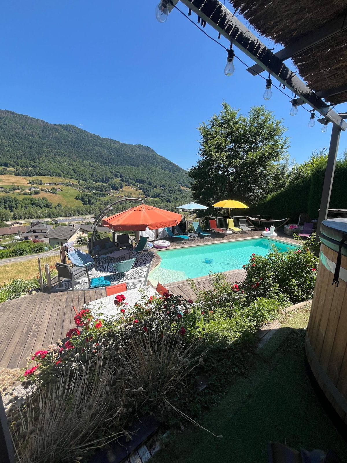 Saint-Jorioz, lângă Annecy, vilă superbă în calm, foarte echipată, piscină, 8 persoane. Casă foarte frumoasă de 130 m2, ideală cu piscină. Superb împădurit și teren foarte însorit de 1300 m2, vedere clară la munte. 2 km de centrul orașului Saint-Jorioz, 800 m de lac, 400 m de calea de biciclete și 10 km de centrul orașului Annecy. Rază de soare maximă toată ziua. Vei aprecia calmul, priveliștea, piscina (cu înot împotriva curentului) și ștampila casei.