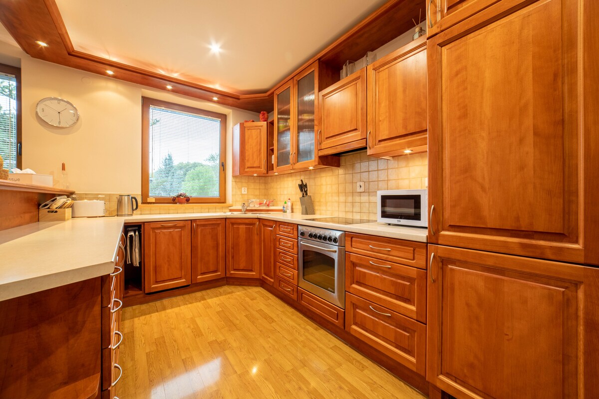 Apartament generos de 170 m2 Maisonette are 5 camere, un living conectat la bucătărie și o baie cu Wi-Fi. Apartamentul este situat direct în centrul orașului Rajske Teplice, la numai 200 m de spa - Spa Aphrodite. Apartamentul are, de asemenea, două locuri de parcare într-un garaj acoperit și o grădină privată cu groapă de foc, grătar și scaune în aer liber.