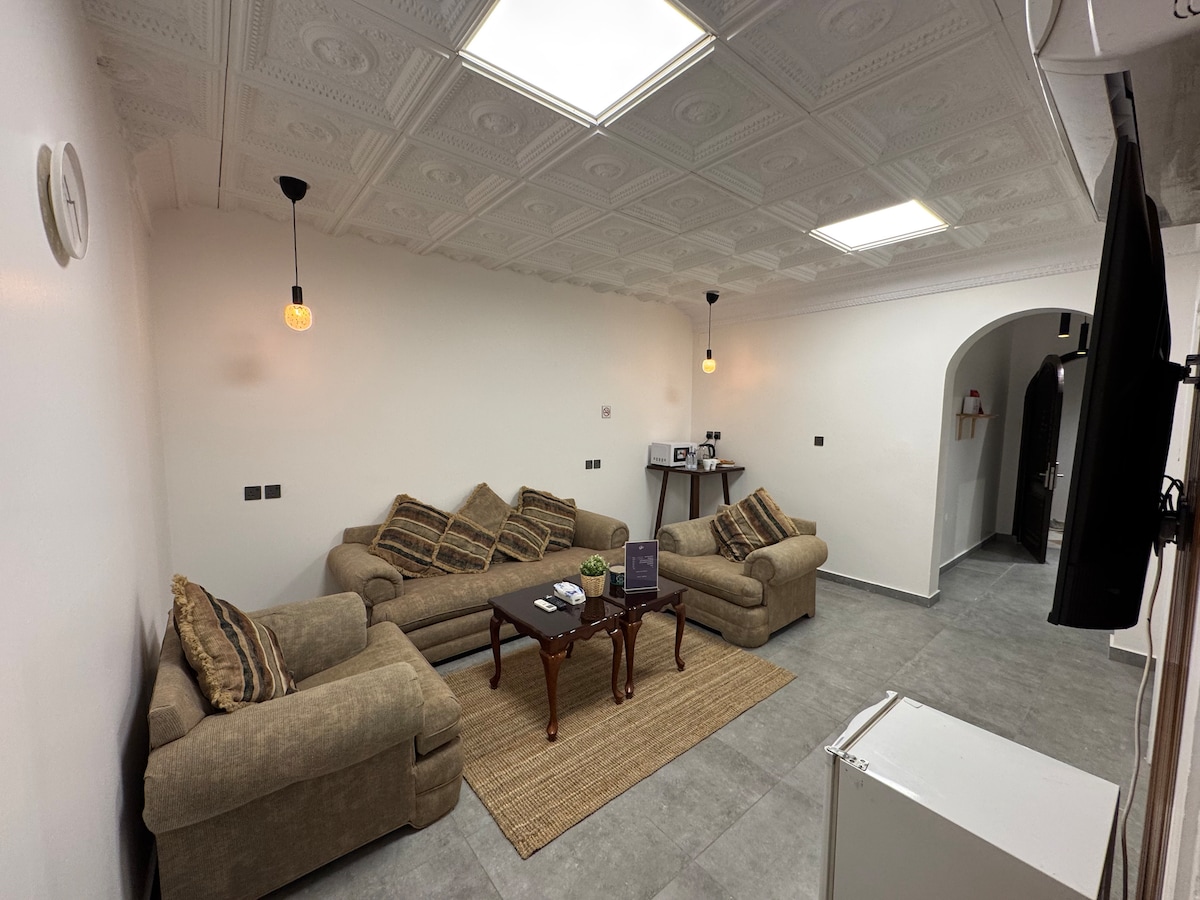 Bucură-te de o noapte relaxată, relaxantă și relaxantă. Acesta este situat între Moscheea Profetului și Moscheea Quba (5 minute cu mașina și 25 de minute de mers pe jos de Moscheea Profetului și de Moscheea Quba cu 3 minute cu mașina și 20 de minute de mers pe jos ) Spațiul are tot confortul unui dormitor cu pat dublu, un lounge confortabil cu un ecran de 65 inch, o bucătărie echipată și o toaletă integrată. Prezentarea Acces Wi-Fi gratuit. Lift. Parcare gratuită lângă spațiu Disponibilitatea non-stop a serviciilor și a restaurantelor Îți dorim o ședere plăcută