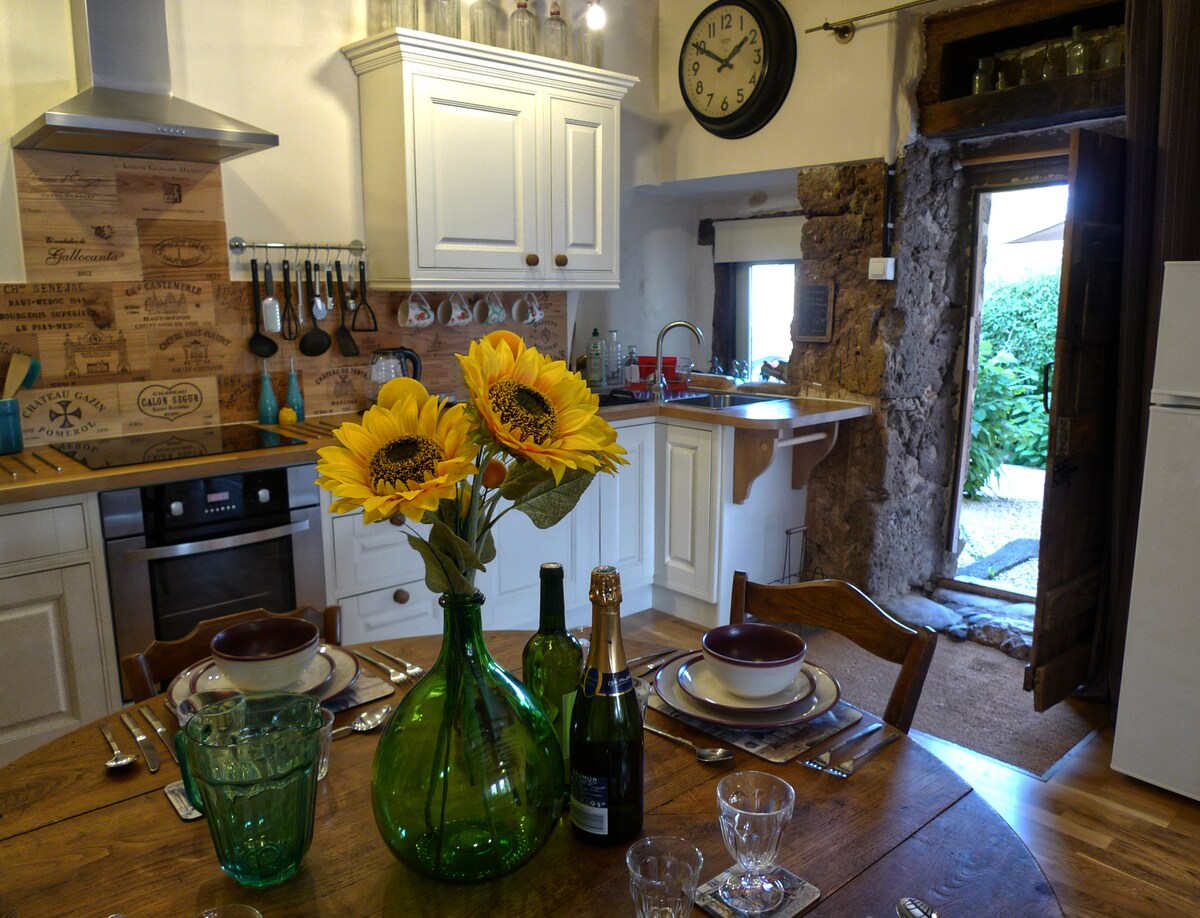 Maison de village, classée 3 épis, entièrement rénovée, pierres apparentes et bois, de grand confort, toute équipée, pour 5 pers avec un "Espace Détente", spa et sauna privatifs. Repas livré à votre arrivée sur demande. "Accueil Vélo" et "Accueil Motards". Equipement bébé, baby-sitting. Cour privative, parking, Internet, WIFI. Prestations Bien-être, massages, yoga, méditation, cours de cuisine.