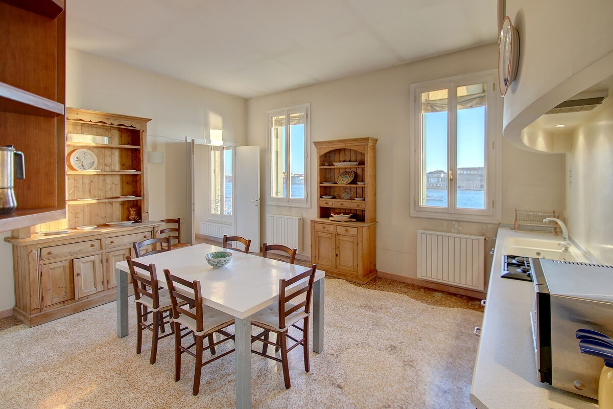 Admiră frumusețea Veneției de la ferestrele boltite ale acestui apartament primitor și spațios, care combină elemente istorice, cum ar fi grinzile din lemn și mobilierul contemporan. De la ferestrele mari te poți bucura de o priveliște frumoasă asupra canalului, traversată de gondole, și a clădirilor gotice tipice din Dorsoduro, cel mai autentic cartier din Veneția, apreciat de artiști și intelectuali de toate vârstele; echipat cu două băi și orice confort, vei găsi cărți și obiecte de artă.