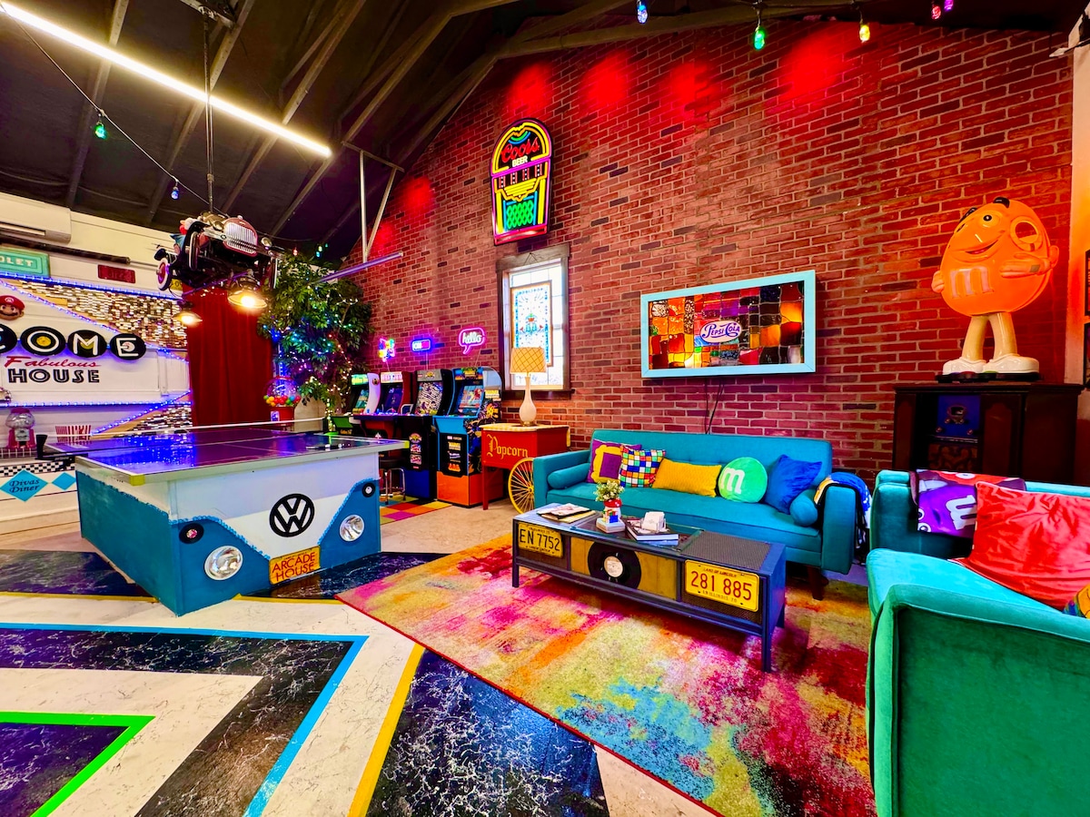 Ready to get your kicks on Route 66? Your group of up to 11 will have a blast playing more games than you’ve ever seen in a vacation home. House of Games lives up to its name with skee ball, ping pong, air hockey, pop-a-shot, foosball, classic game-console room – and more. Guests praise the variety and fun of 10 arcade games. Kiddos love it here, and families cherish spending time playing games together. Relax in the backyard with firepit, grill, hammock. All this – plus free soda + ice cream.