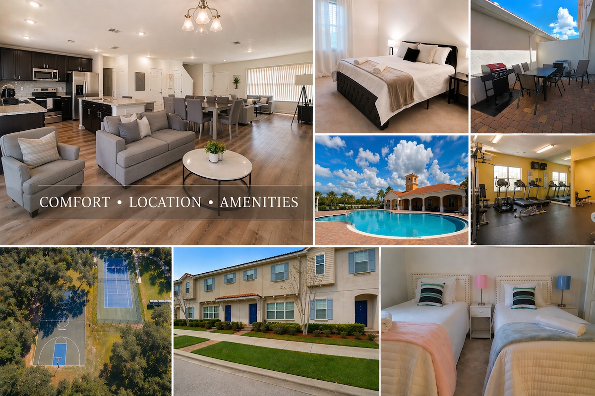 Această locuință modernă și proaspăt mobilată este deschisă ție și familiei sau prietenilor tăi! Bucură-te de zona noastră de terasă, unde avem o piscină frumoasă și un spațiu deschis pentru luat masa în aer liber sau doar pentru relaxare la soare. Situat în apropierea intersecției dintre Florida Centrală Pkwy și S. John Young Parkway, Orlando, FL 32837. Vizavi de Ritz Carlton Hotel & JW Marriott Hotel. Îți urăm bun venit să-ți rezervi șederea la noi și să faci din camera noastră privată cu 3 paturi, 2 băi cu piscină și parcare gratuită!