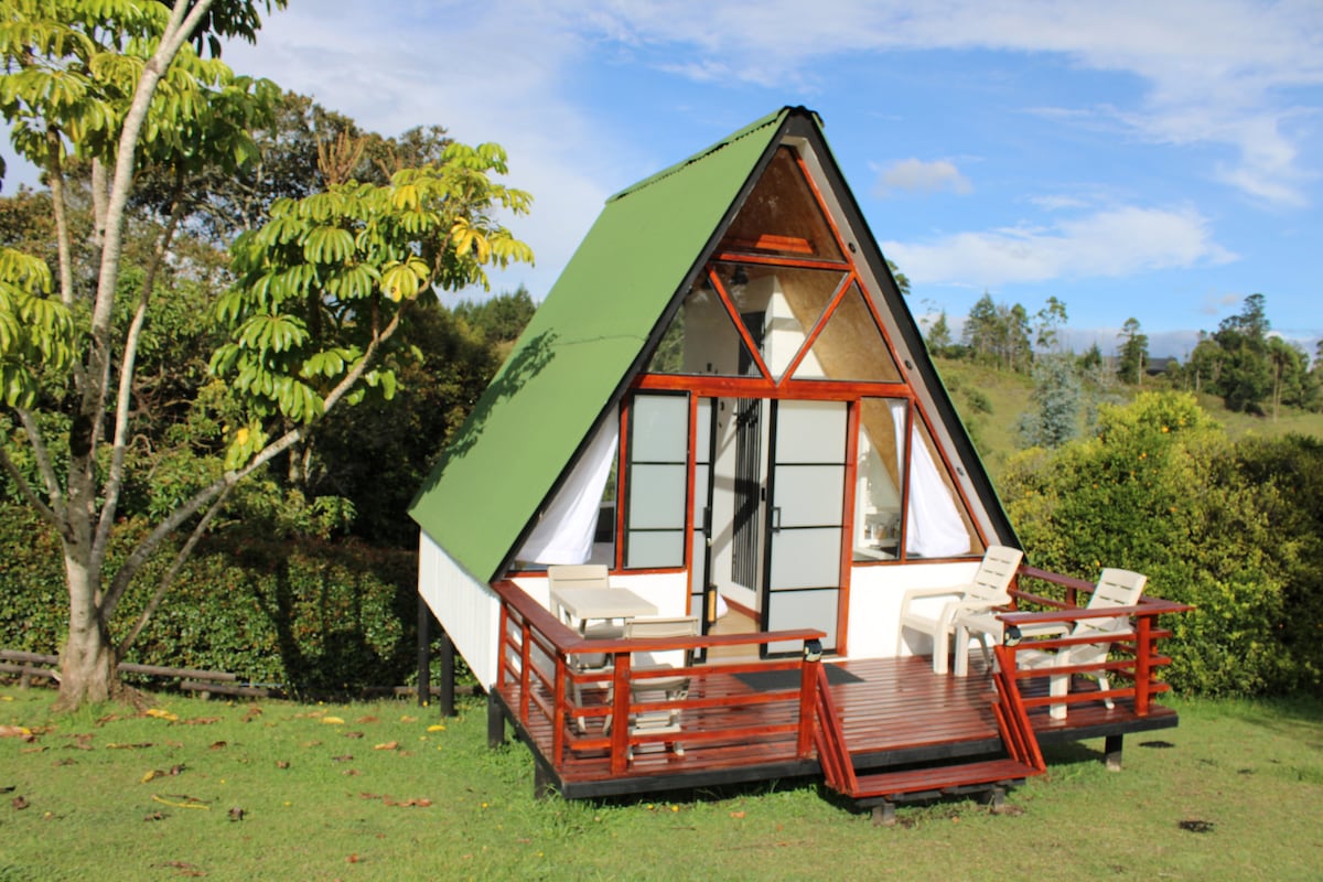 Cabana de refugiu în pădurea tropicală din Guarne, Antioquia, Medellín, înconjurată de munți maiestuoși și de sunetele liniștitoare ale păsărilor și fluturilor. Bucură-te de răsărituri uluitoare și reconectează-te cu natura de pe terasa spațioasă a cabanei noastre confortabile, unde poți savura cafea și admira priveliști uimitoare. În interior, o baie cu tavan din sticlă te invită să te relaxezi în timp ce chicineta complet echipată îți îmbunătățește șederea. Cu mobilier de exterior pentru mese în aer liber și căi liniștite de explorat, te vei simți în rai!