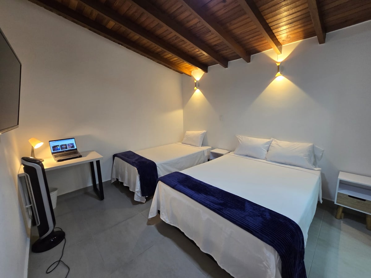 Bine ai venit în locuința ta din Medellin! Descoperă energia vibrantă a sectorului Laureles-Estadio din casa noastră confortabilă și liniștită, ideală pentru grupuri de 7 persoane. Întreabă despre parcarea privată aflată la doar 4 minute de mers pe jos, este foarte ieftină. Îți oferim un spațiu modern și funcțional conceput pentru confortul tău. Relaxează-te în living, care are o canapea extensibilă confortabilă și un televizor HD mare, plus un spațiu de lucru dedicat.