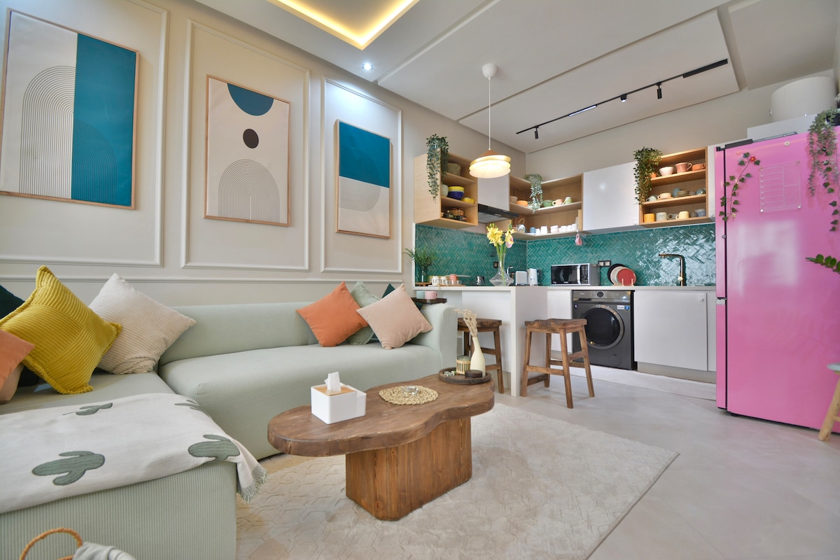 Cazează-te în inima orașului Marrakech, în apartamentul nostru cu 2 dormitoare și 2 băi. Bucură-te de lenjeria de pat de lux Simmons, de Wi-Fi de mare viteză (fibră optică) și de un decor modern, cu o piscină privată. Bucătărie complet utilată, cadă elegantă și duș italian. La o scurtă plimbare de piața Jemaa el-Fna, Plazza și Carré Eden. Piscina nu este încălzită. NB: Cuplurile marocane necăsătorite nu sunt permiși.