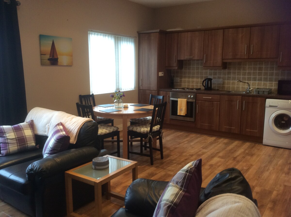 1 bedroom apartment on the first floor with a large bedroom ensuite and a couch bed in living room apartment has had a full refurbishment done and all furniture and fittings brand new just behind the main street in letterkenny close to everything loads of hot water and towels and toiletries. teas coffees cereals milk and orange juice