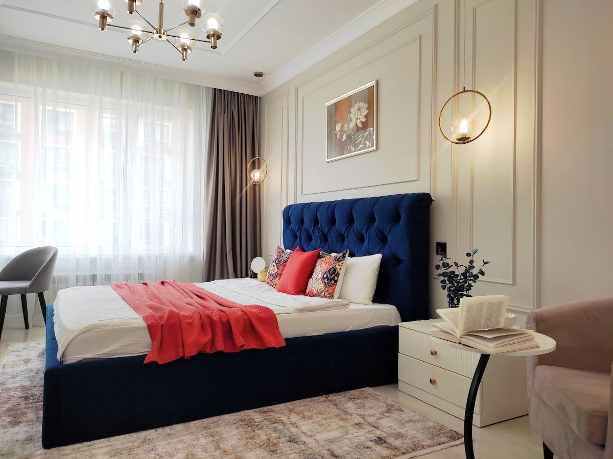 Studio modern de 34 m² în cartierul de sus Almaty, lângă mall-ul MEGA. Potrivit pentru 3-4 persoane: pat cu saltea ortopedică (pentru două persoane) + canapea (pentru un adult sau doi copii) Televizor inteligent de 55"cu Netflix, WiFi, AC Bucătărie complet utilată, mașină de spălat rufe, uscător de păr, fier de călcat, veselă. Lenjerie curată, prosoape. Încuietoare electronică, check-in fără contact. Totul pentru o ședere confortabilă și confortabilă!