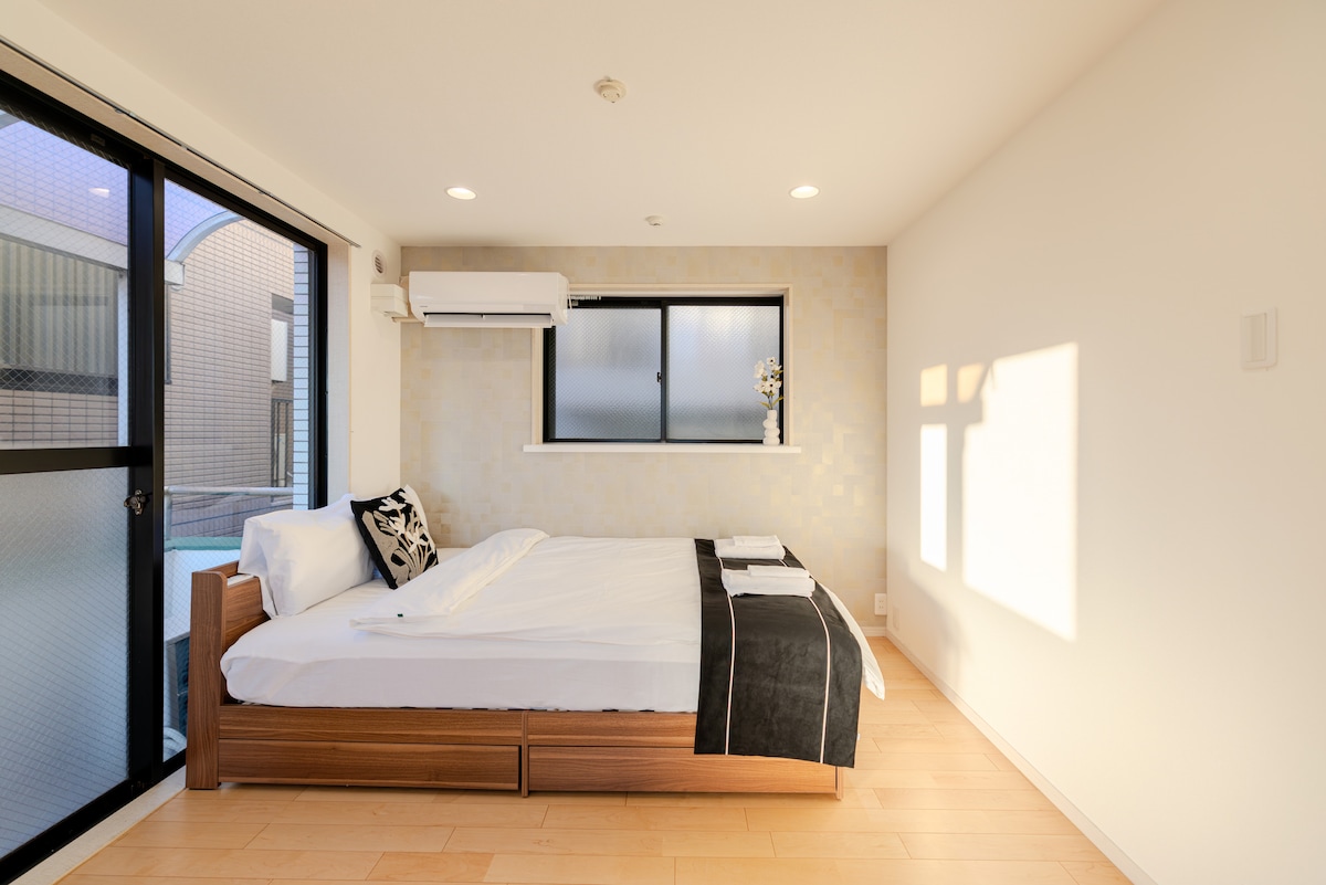 Un loft liniștit, minimalist, la doar o stație de Shibuya și Roppongi-, perfect pentru persoanele care călătoresc singure sau pentru lucrul la distanță. Dispunând de Wi-Fi rapid, un scaun Aeron și un pat dublu compact (150×210 cm)- ideal pentru o persoană, confortabil pentru două persoane. Baia din sticlă și pereții eleganți din beton îi conferă o margine modernă (notă: condens de iarnă - doar pornește ventilatorul băii). Deși nu există dulap, spațiul se potrivește pentru patru valize mari și include o bară de agățat și zece cârlige de perete pentru a păstra lucrurile ordonate. Serviciu de spălătorie săptămânal.