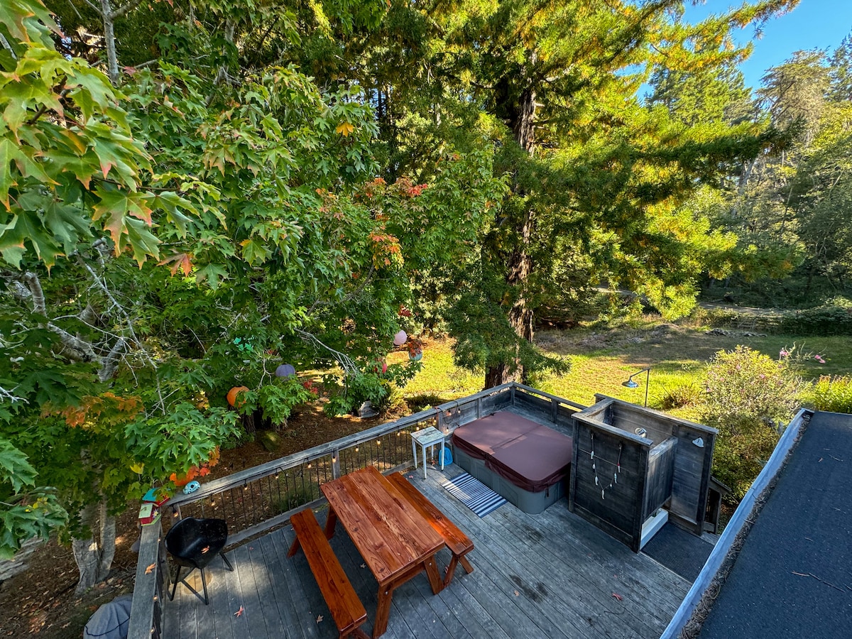 Surrounded by towering redwoods, experience the magic of the Moonshack. Equipped with a tiny office and Further Reach business internet at 35 MBPS, it's the perfect place to dream, write, work and relax. Level 2 EVC. Unwind from your adventures in a cozy living room with TV and sound bar with streaming options. Large fenced in yard for dogs and a private hot tub and outdoor shower. Minutes drive to downtown Gualala, shops, and local beaches. Compact and quaint space to relax.