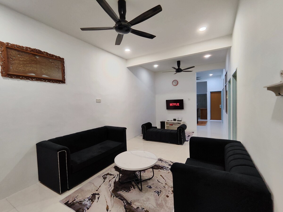 Adu întreaga familie la Laman Bangau Temerloh. Locuința ta confortabilă și spațioasă pentru a te relaxa sau a te juca. Trei dormitoare confortabile, o zonă de joacă pentru copii, Wi-Fi gratuit și YouTube fără anunțuri pe televizorul inteligent îi fac pe toți fericiți. Poarta automată și veranda acoperită te mențin uscat și umbrit în timpul sosirii sau încărcării. Locație perfectă: doar 5 minute până la HoSHAS și 10 minute până la Pekan Sehari. Ședere flexibilă: check-in independent non-stop (sosești la 22:00? Nicio problemă)