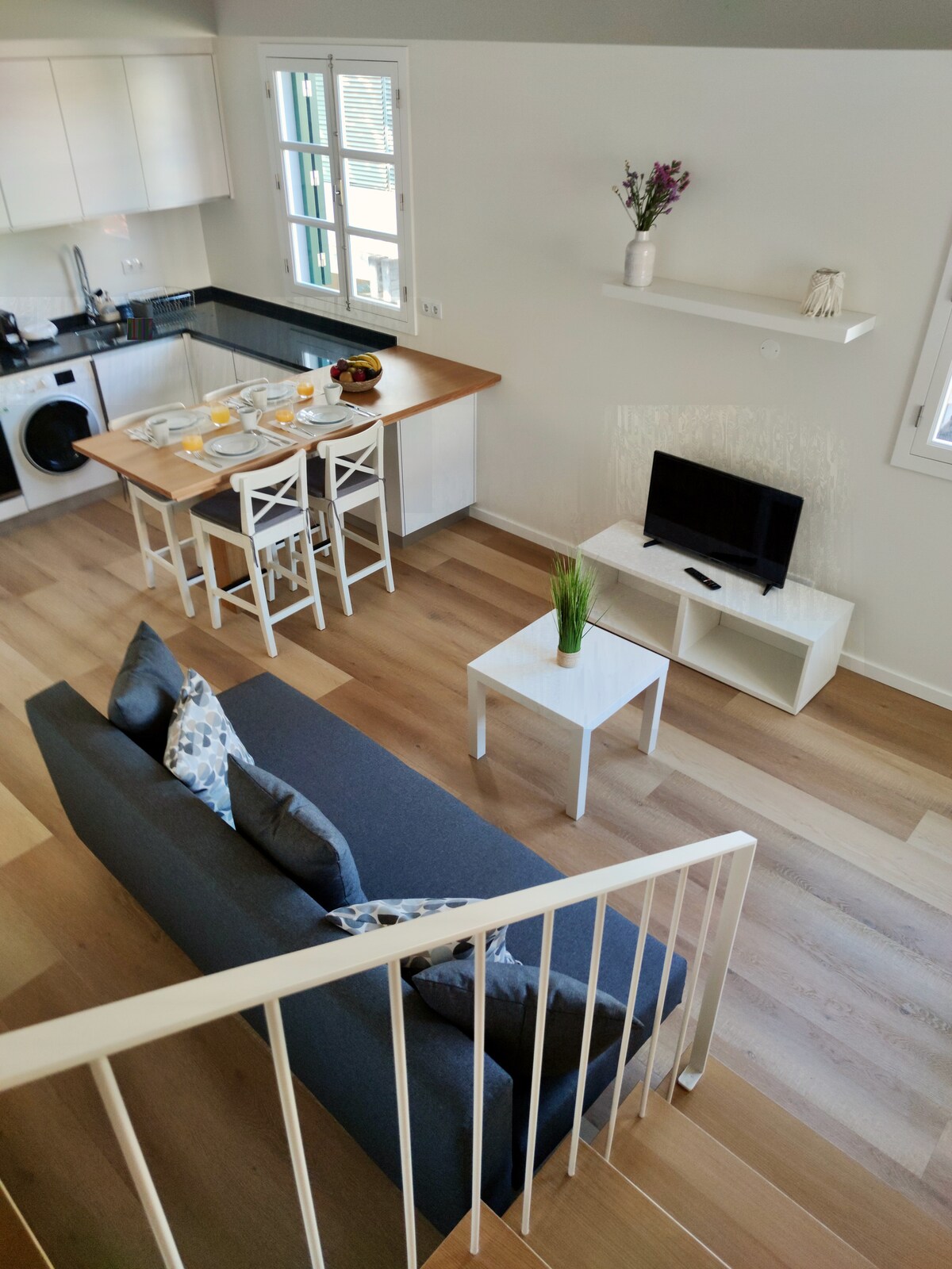 Situat la ultimul etaj al clădirii, acest apartament de 70m2 recuperează magia altor vremuri. Are un living mare cu o canapea extensibilă (dublă), un dormitor cu pat matrimonial, chicinetă și baie cu duș. Terasa mare de pe Rua de Santa Maria dotată cu mese și scaune vă permite să serviți mese în aer liber sau pur și simplu să faceți plajă. Apartament 3 – Etaj 3 T1 - ocupare maximă 4 persoane | cu terasă