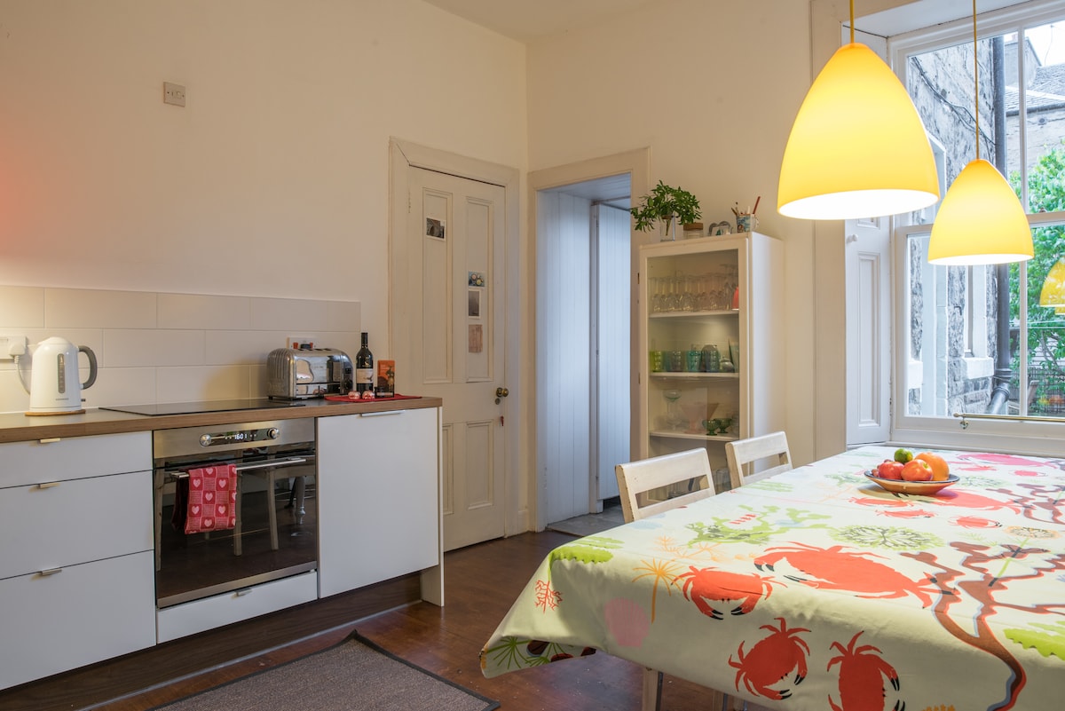 Acest apartament istoric cu 2 dormitoare se află la 15 minute de mers pe jos de centrul orașului Edinburgh prin faimosul parc Meadows. O bază excelentă pentru a explora orașul. Spațiul Un apartament minunat cu două dormitoare, cu un living imens și o bucătărie complet utilată. Accesul oaspeților Apartamentul este al tău pentru a-l folosi. Camera de depozitare din apartament va fi încuiată. Dar, în caz contrar, întregul apartament este deschis pentru tine. Vă rugăm să rețineți: nu există lift/lift disponibil, iar apartamentul este la etajul 4.