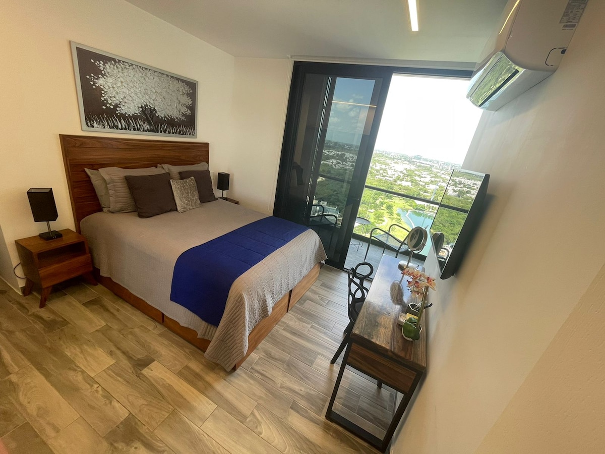 Modern Studio with Lake View in the neighborhood in Merida Enjoy this cozy and stylish studio apartment located on the north side of the city. It features a comfortable bedroom (king-size bed and A/C), a full-size sofa bed, a fully equipped kitchen, and a bathroom with amenities (towels, hairdryer, iron). Relax with a stunning lake view and access exclusive amenities within the building. Your stay will be comfortable and unforgettable!