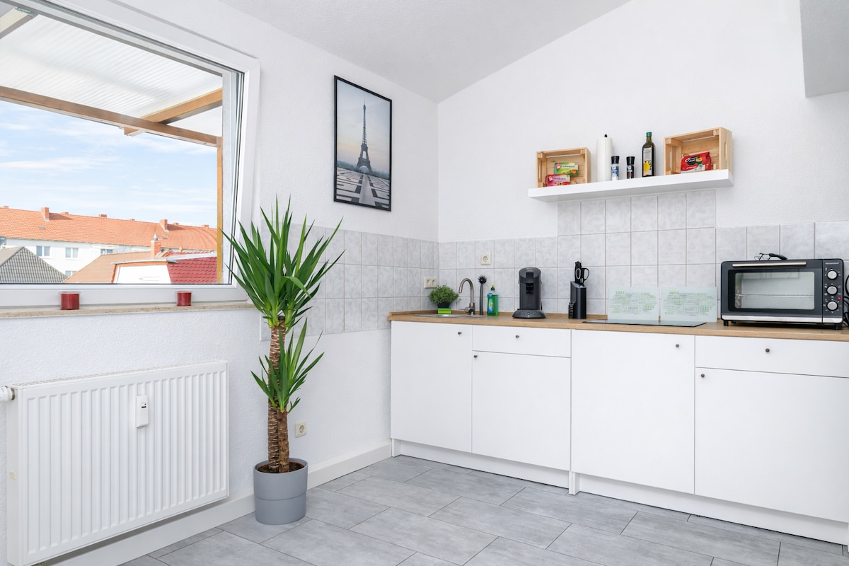 Apartament confortabil la mansarda unui bloc de apartamente foarte bine întreținut. Există un pat și o canapea extensibilă, precum și o chicinetă și o baie mare cu duș. Chiar în fața casei se află un loc de parcare pentru o mașină. Centrul vechi, castelul, catedrala și gara se află la câțiva pași. Alte destinații, cum ar fi Geiseltalsee, sunt accesibile rapid cu mașina sau cu bicicleta. Un pat pentru bebeluși și un scaun înalt sunt, de asemenea, disponibile.