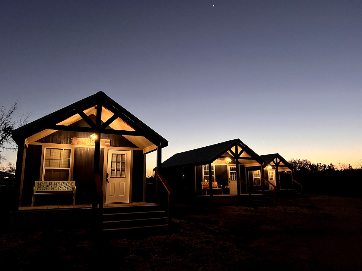 Bluebonnet, 1 din 4 cabane confortabile pentru oaspeți de pe ferma Rosemary Ranch. Aproape de natură, fără a sacrifica confortul. Ieși afară pe propria verandă mică, perfectă pentru a savura cafeaua de dimineață sau pentru a privi apusurile de soare. În cadrul experienței, poți saluta puii noștri prietenoși care cutreieră împrejurimile, adăugând o notă unică de viață la fermă șederii tale. Vino cufundă-te în ritmul liniștit al vieții gospodăriei din Texas, la doar câteva minute de Cooper's Live (1/2 mile) și Christoval Winery (2 mile).