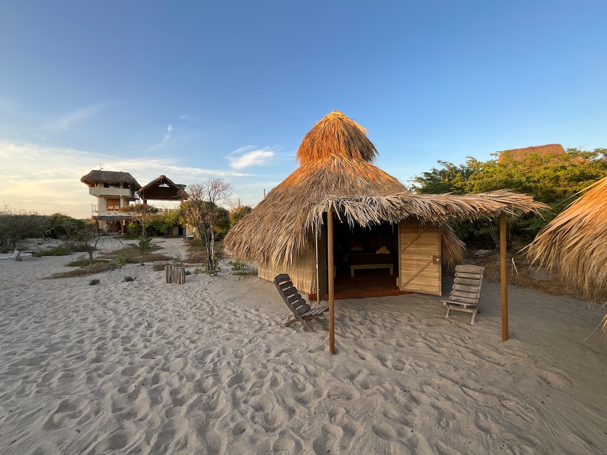 Cabaña típica chacahuense "Palapa"con fabulosas vistas al mar. Dispone 2 camas queen size lo que lo hace ideal para 4 personas. Disponemos startlink. La cabaña dispone de ventilador de techo, protegida con tela mosquitera en todo la palapa. Duerme con el sonido de las olas y ve el amanecer desde el porche de la cabaña.